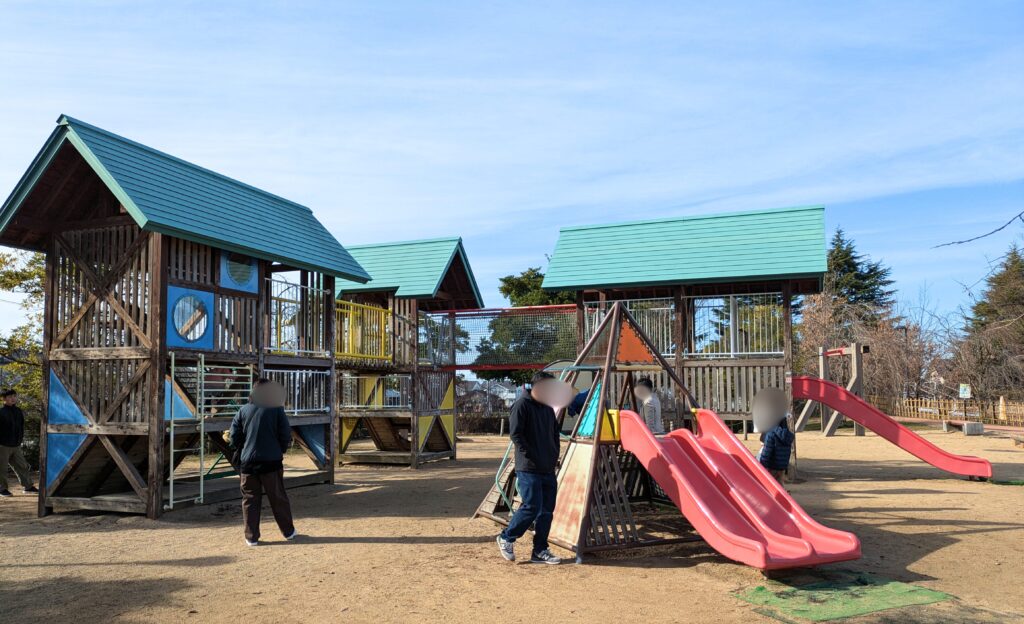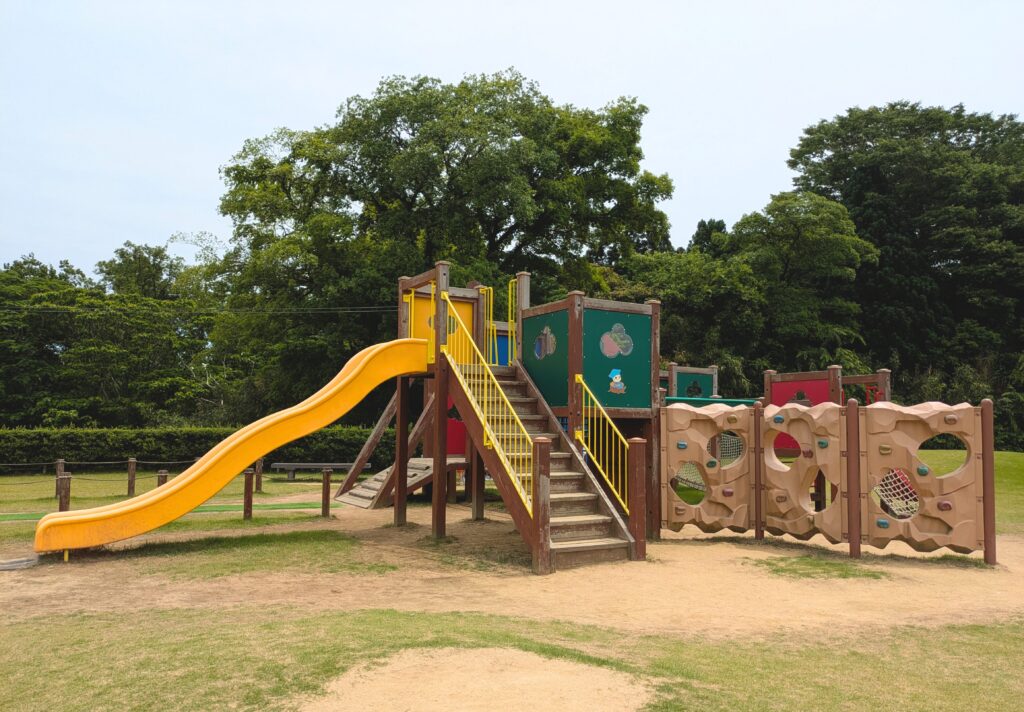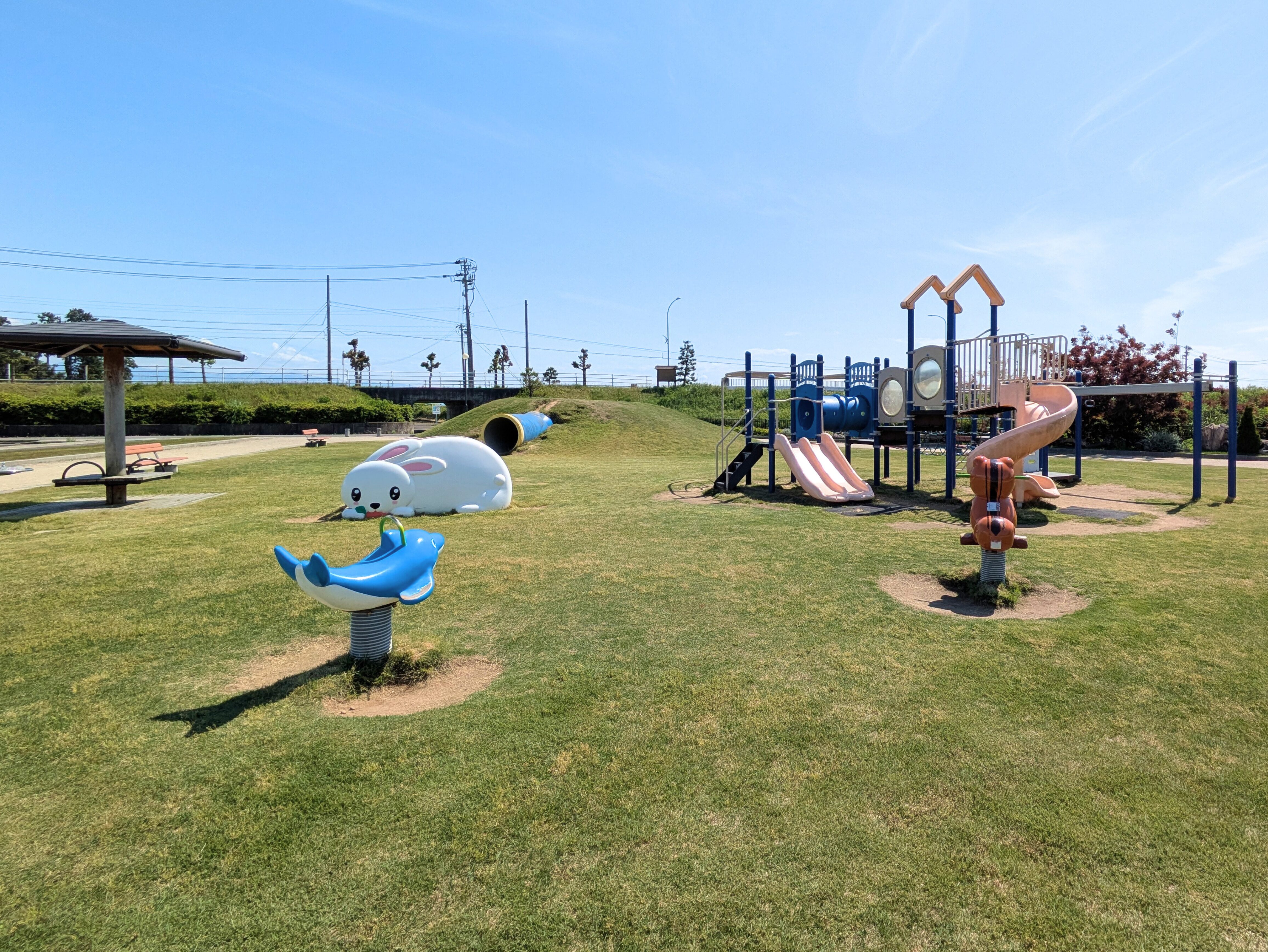 複合遊具やターザンロープ、ネット型遊具などが揃っていて、元気いっぱい遊びたい子どもにぴったり。芝生もあるのでボール遊びやピクニックも楽しめます。